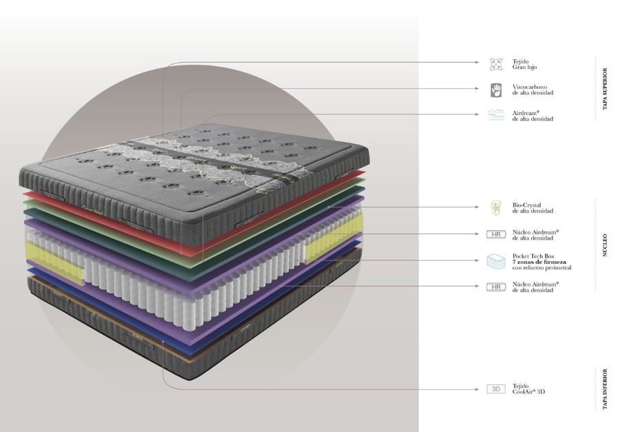 El colchón ENERGY SPORT, ha sido creado específicamente para mejorar el bienestar del cuerpo después del ejercicio intenso. Colchón de alta gama de muelles ensacados con Pocket Tech Box con 7 zonas de firmeza y con componentes como el viscocarbono y biocrystal. Núcleo con Pocket Tech Box 7 zonas de firmeza, con doble tratamiento térmico para evitar la corrosión utilizando el 55% del acero reciclado.