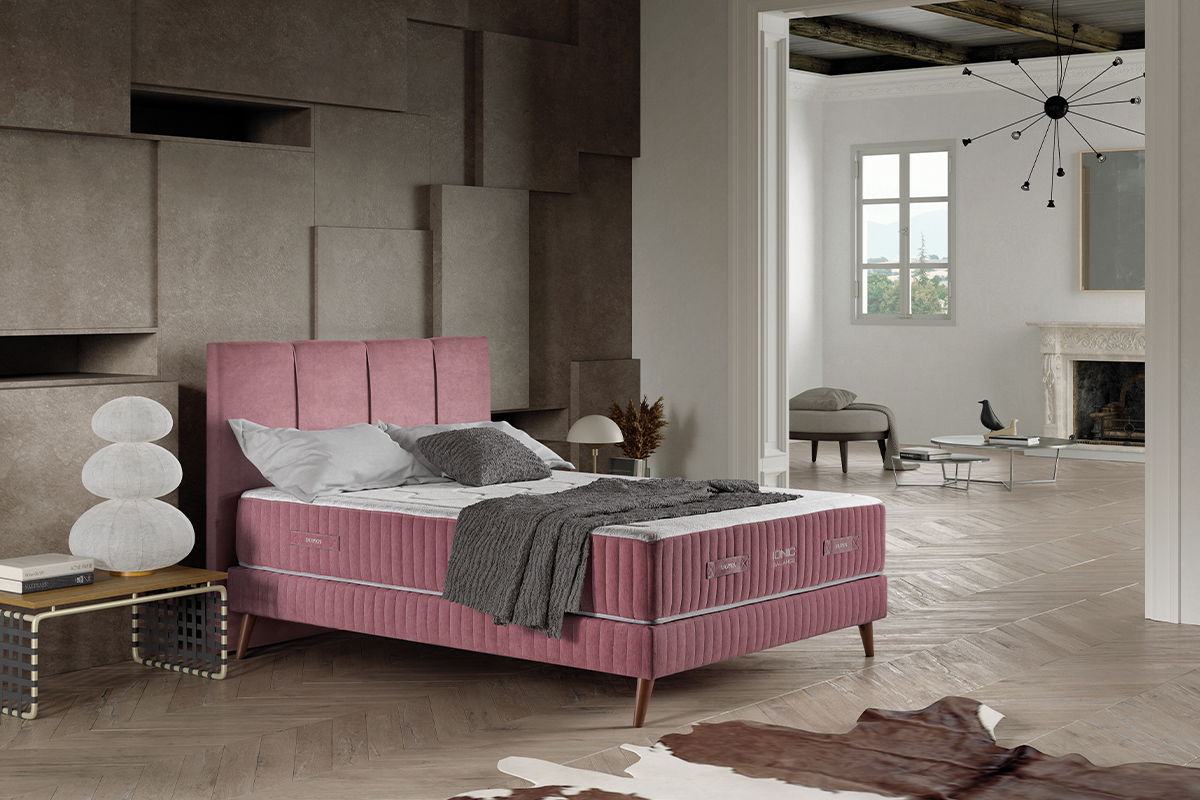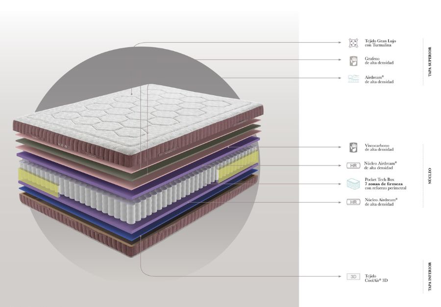 Núcleo con Pocket Tech Box 7 zonas de firmeza, con doble tratamiento térmico para evitar la corrosión utilizando el 55% del acero reciclado. El viscocarbono termosensible de alta densidad ofrece todas las ventajas de este material de última generación ayudando a liberar la electricidad estática del cuerpo y puntos de presión.