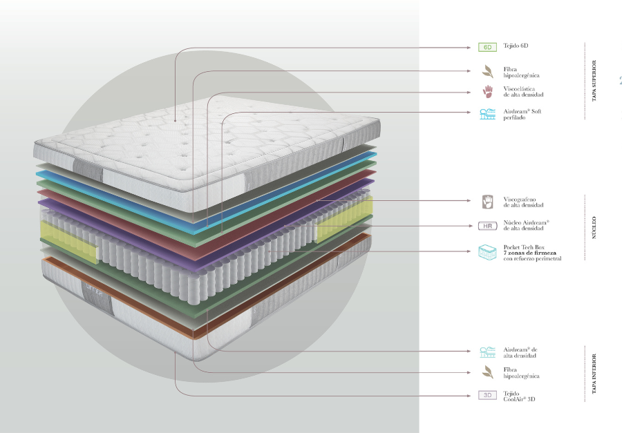 Este colchón de muelles ensacados con box perimetral con 7 zonas de firmeza es especialmente cómodo gracias a la viscografeno, que permite el paso del aire, aportando una excelente transpirabilidad, ayudando a mantener el nivel óptimo de humedad y regulando la temperatura. La tapa inferior está compuesta por una capa de Airdream® de alta densidad acompañada de fibras hipoalergénicas y tejido CoolAir® 3D.