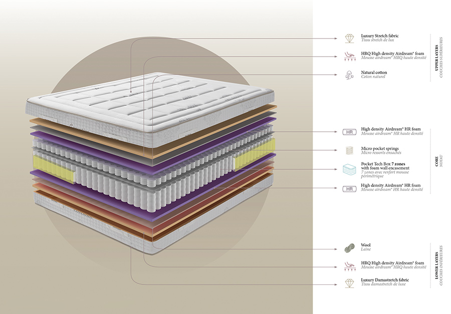 A mattress with exclusive comfort to provide unique comfort and restful sleep. Core with Pocket Tech Box 7 firmness zones, with double heat treatment to prevent corrosion using 55% recycled steel.