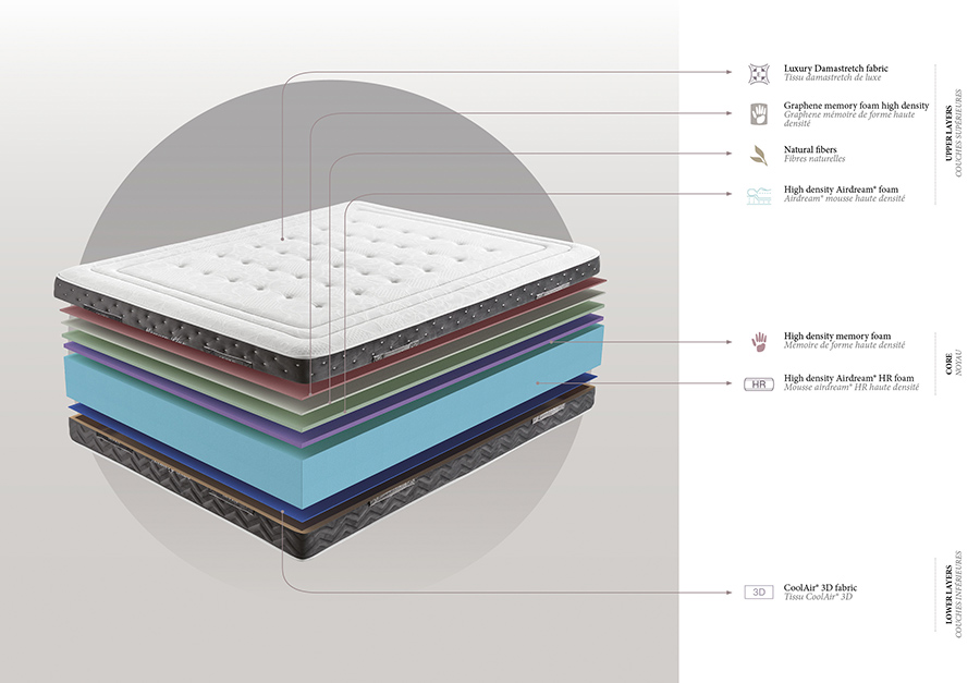 This elegant mattress is upholstered with luxurious stretch fabrics The mattress is super-soft, with padded sides, six embroidered horizontal handles on sizes over 120 cm wide to facilitate turning the mattress over, and breathable CoolAir 3D® cooling fabric for the mattress support area, which helps regulate body temperature by dissipating moisture and maintaining optimal warmth and comfort during sleep.