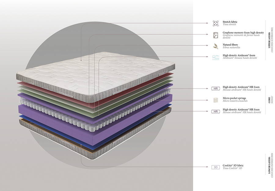 Stretch fabric, high density viscographene, hypoallergenic fiber and high density Airdream® in the top cover. Mattress withhigh density Airdream® core and pocketed micro-springs casing.